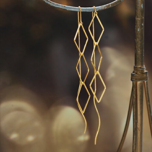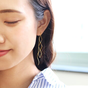 )風に吹かれてキラキラ揺れるゴールドの輝き K18ゴールドアメリカンピアス・ディアメリー 「シンプルさで差をつける、大人のおしゃれ」 今年は例年以上に、大ぶりピアスが流行の兆しがあるんだとか・・SNS映えする大ぶりピアスは、雑誌やモデルさんの間でも人気集中!派手すぎるデザインは取り入れるのが難しいから、こんなピアスはいかがですか? ゆらゆらと揺れるたびにモチーフが光を反射してキラキラ・・また、ひし形のモチーフが互い違いにつけられているので、どこから見ても美しいシルエットを保つことができます!計算された黄金バランスで並べられたシャープで美しいダイヤ型は、遠くから見ても目を引きます。