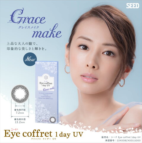 処方箋不要で買えるカラコン◆商品名:Eye coffret 1day UV Grace make(グレー)◆モデル:北川景子◆使用期間:1日◆DIA:14.0mm◆入数:1箱10枚◆BC:8.7mm◆含水率:38.0%◆視力補正用コンタクトレンズ(度ありカラコン)◆医療機器承認番号:22400BZX00111000◆製造国:◆製造販売元:株式会社シード◆販売元:株式会社シード→プラス度数はこちらです。