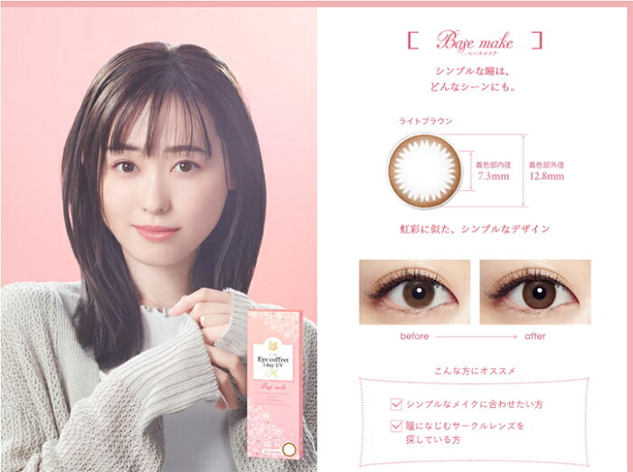 メール便 全国送料290円 不在が多い方におススメ!自宅のポストへ配達 MODEL:北川景子 メーカーシード【SEED】 商品名アイコフレワンデーUV MEyeCoffret 1day UV M 使用期限1日使い捨て 入数【10箱セット】1箱10枚入り カラー(6色) ・ベースメイク ・ナチュラルメイク ・リッチメイク ・ファーストメイク ・シアーメイク ・スウィーティメイク 度数(POWER)度なし(±0.00)-0.25~-6.00(-0.25ステップ)-6.50~-12.00(-0.50ステップ) 直径(DIA) 14.0mm(ベース・ナチュラル・リッチ) 14.2mm(ファースト・シアー・スウィーティ) 着色外径 ・ベースメイク:12.8mm ・ナチュラルメイク:13.0mm ・リッチメイク:13.2mm ・ファーストメイク:13.3mm ・シアーメイク:13.1mm ・スウィーティメイク:13.5mm ベースカーブ(BC) 8.70mm 保存液の主成分アルギン酸配合 UVカットUV-A75%、UB-B95%カット 種別カラコン 度あり カラーコンタクト 度入り サークルレンズ フチなし 医療機器承認番号23000BZX00077000 広告文責TKシアン株式会社【CiACON シアコン】 高度管理医療機器等販売業:第2450179号 使用上の注意 ◎決められた期限を超えて絶対に使用しないでください。
