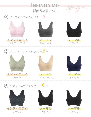 サイズ S-M:バスト72-87cm L-LL:バスト86-101cm 3L-4L:バスト100-115cm タイプカラー [1]ノーマルブラック3枚 [2]ノーマルチャコール3枚 [3]ノーマルネイビー3枚 [4]インフィニティミックスA [5]インフィニティミックスB [6]インフィニティミックスC [7]バラエティミックスA [8]バラエティミックスB [9]バラエティミックスC [10]ノーマルブラックミックス [11]ノーマルホワイトミックス [12]ノーマルピンクミックス [13]パイピングミックス [14]クールミックス [15]クールブラック3枚 [16]メッシュミックス [17]メッシュブラック3枚 素材 本体:ナイロン90%、ポリウレタン10%、パッド:ポリウレタン100% 保証期間 商品到着後30日間にお申し出いただいた初期不良のみ交換対応させていただきます。